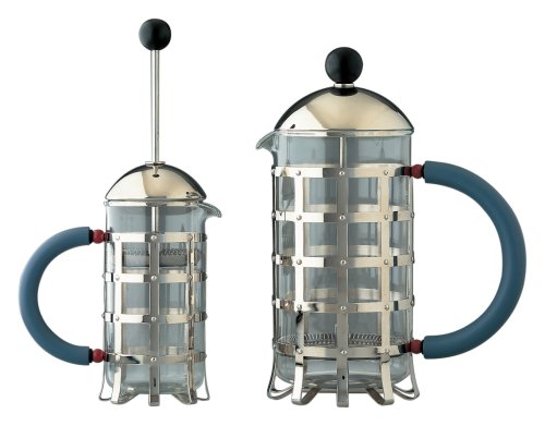 Alessi offre Produit: Cafetière à piston ou infuseur - Designer: Michael Graves - Matériel: Acier inoxydable 18/10 brillant et verre résistant à la chaleur - Traits: Capacité 24 cl. (3 tasses). Il fonctionne aussi comme infuseur. - Dimensions: Ø7.10 H.18